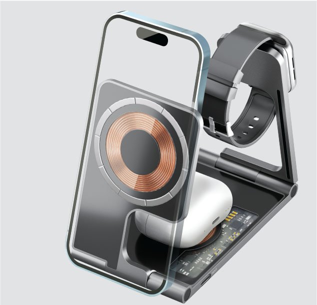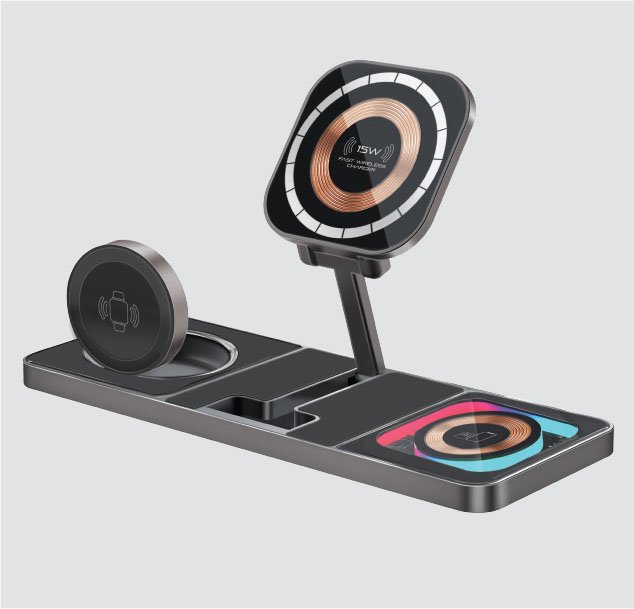 Multi-Port Wireless Charging Station with a powerful output, this sleek station fuels your devices at lightning speed. The MagSafe-compatible 15W wireless charger and dedicated 5W AirPods charger make wireless charging a breeze.