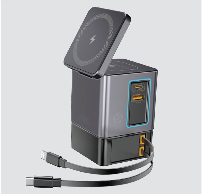 105W GaNFast Multi-Port Wireless Charging Station with Dual Retractable Cables